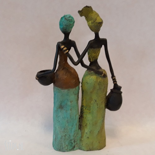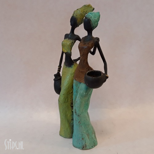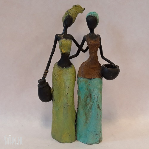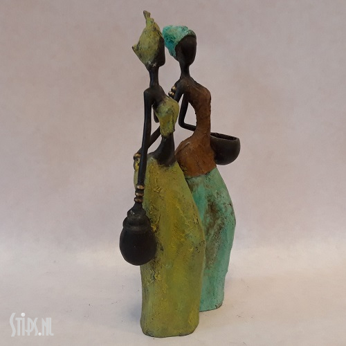Deze kleurrijke Afrikaanse dames zijn prachtig afgebeeld met hun manden in de hand. Gezellig samen op weg om naar de markt te gaan in hun typisch Afrikaanse kledij met bijpassende hoofdtooi. De traditionele Afrikaanse manier van leven ten voeten uit, een bijzonder mooi beeldje.