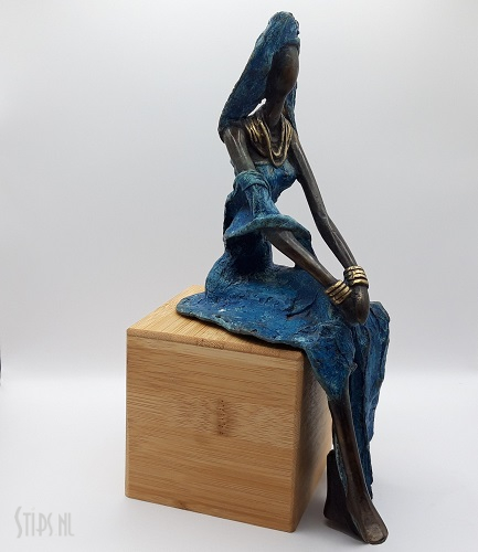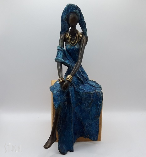 Deze indrukwekkende Afrikaanse dame is gekleed in een prachtige wijdvallende blauwe jurk. Ze draagt het zwierige kleed met stijl en heeft de rok elegant gedrapeerd over de zitting en 1 been. Van het andere been zien we een stukje tussen de rokplooien door. Het blauw van de jurk komt terug in haar hoofdbedekking, de strakke hoofddoek loopt uit in lange stroken naar beneden hangende stof. De gouden sieraden die onze zittende dame draagt zijn ook duidelijk Afrikaans, een breed tribal halssieraad bestaande uit diverse ringen en strengen met bijpassende armbanden..