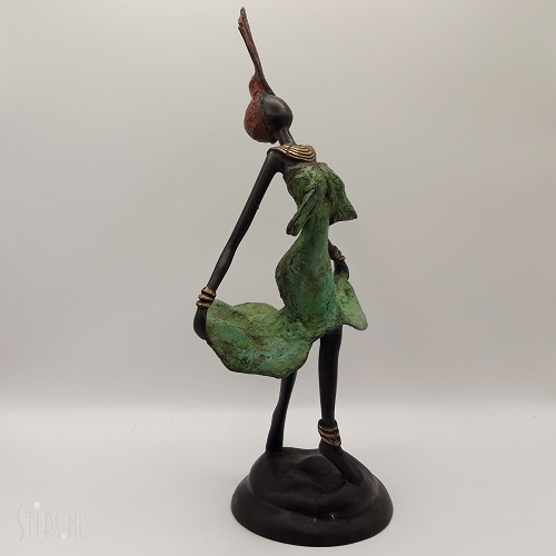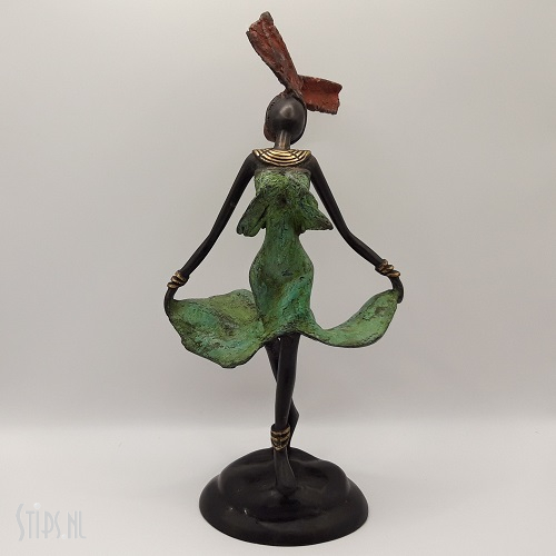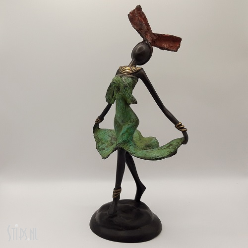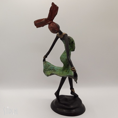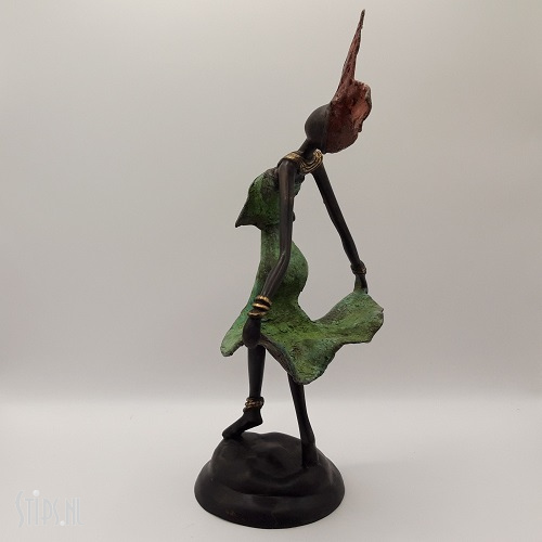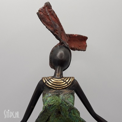 Deze kleurrijke Afrikaanse dame heeft plezier in het leven. Ze danst vrolijk in het rond terwijl ze haar opgetilde rokje mee laat swingen in de rondte. Op haar hoofd zien we een rode hoofddoek die uitloopt in een supergrote recht omhoog staande strik Gouden armbanden, enkelbanden en halsbanden vervolmaken het prachtige portret. Echt een plaatje!