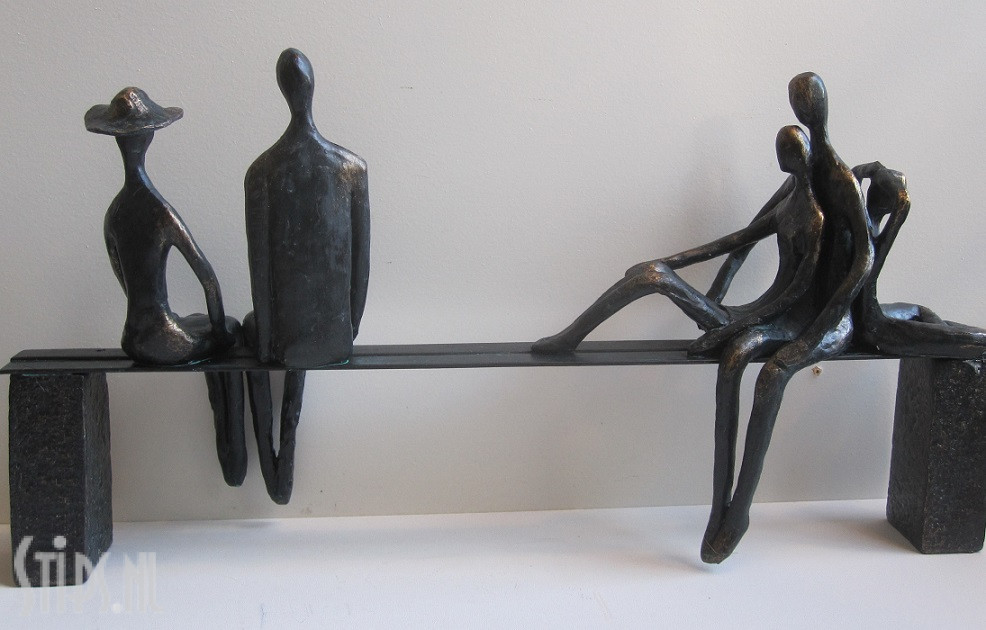 Vader en moeder zitten rustig naast elkaar aan de ene kant van de bank. Mama draagt een hoed tegen de zon en het lijkt er op alsof ze al direct weer verder wil, maar ze moet nog even geduld hebben tot iedereen weer verder kan. .Aan de andere kant van het bankje zien we de kinderen. Lekker ontspannen met zijn drieën tegen elkaar hangend, voeten op de bank, even rustig bijkomen van de wandeling. Gelukkig is de bank groot genoeg en heeft iedereen voldoende plek om op zijn eigen manier even te relaxen.
