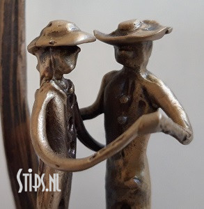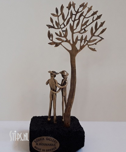 Het beeldje “Men get together” is gemaakt van echt brons.. We zien twee mannen die elkaar vasthouden en samen onder een boom staan.