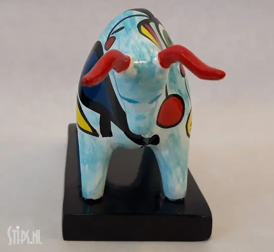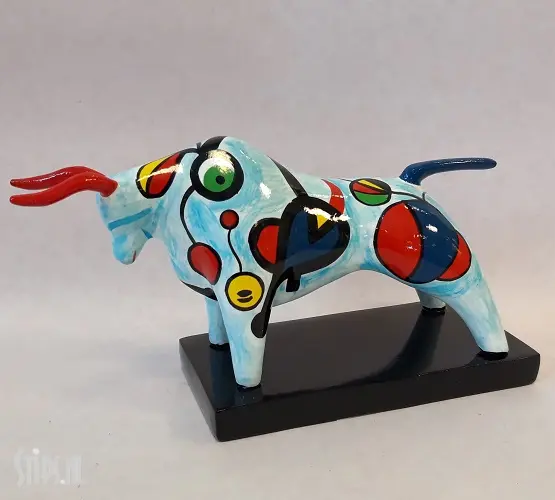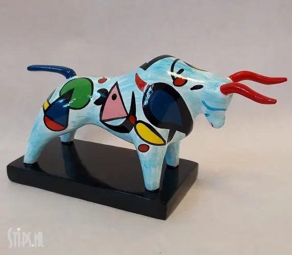 Bull El Torro Miro is een kleurrijk kunsthars beeld van een stier die is beschilderd met vrolijke schilderingen in de stijl van Joan Miró.