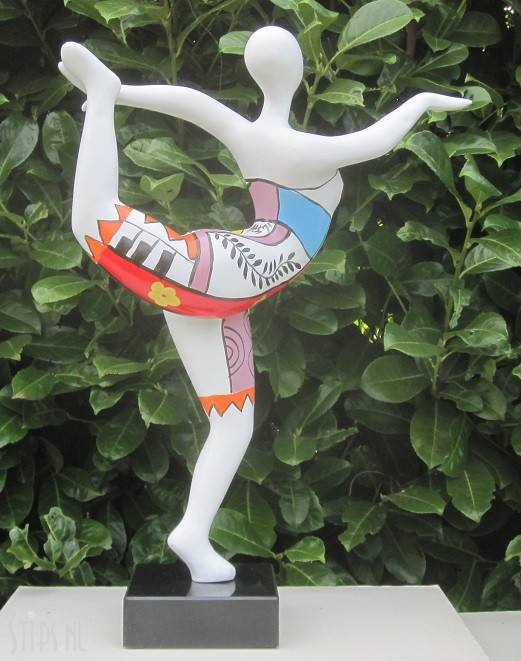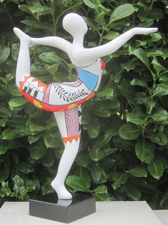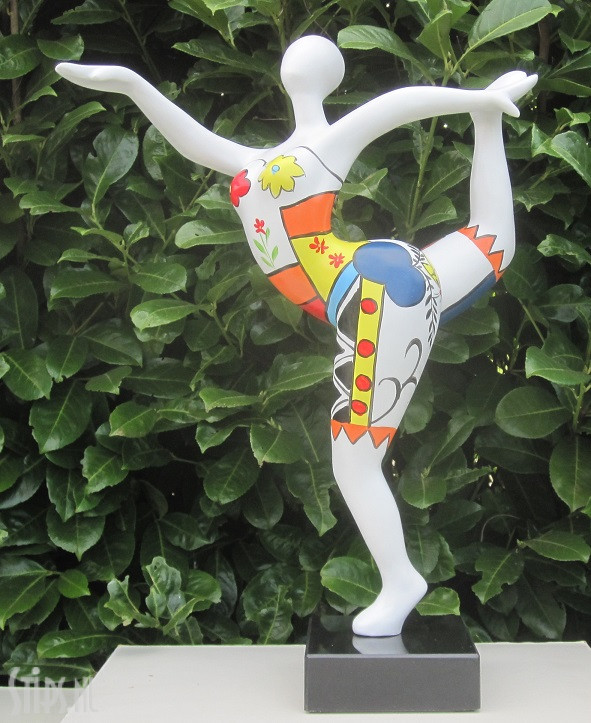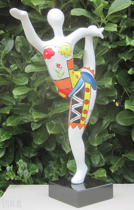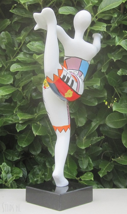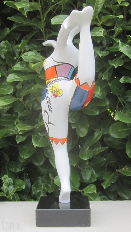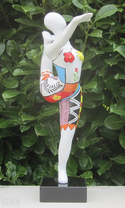 Signora Allegra is een sierlijk beeld van een lenige dame die op 1 been balanceert op een zwart marmeren voetstuk. Met haar armen wijd uitgestrekt houdt ze met 1 hand de voet van haar omhoog gestoken andere been vast. Signora Allegra is in wit uitgevoerd en fantasievol beschilderd met allerlei motieven zoals bloemen, blaadjes, strepen, cirkels, rondjes en een vlinder. Dit alles uiteraard in verschillende kleuren zodat de aanblik van deze dame een lust voor het oog is geworden.