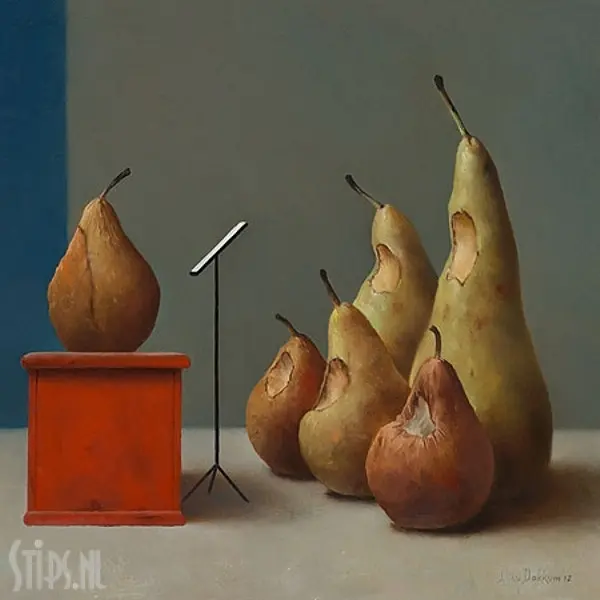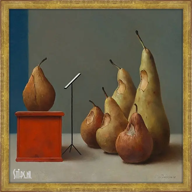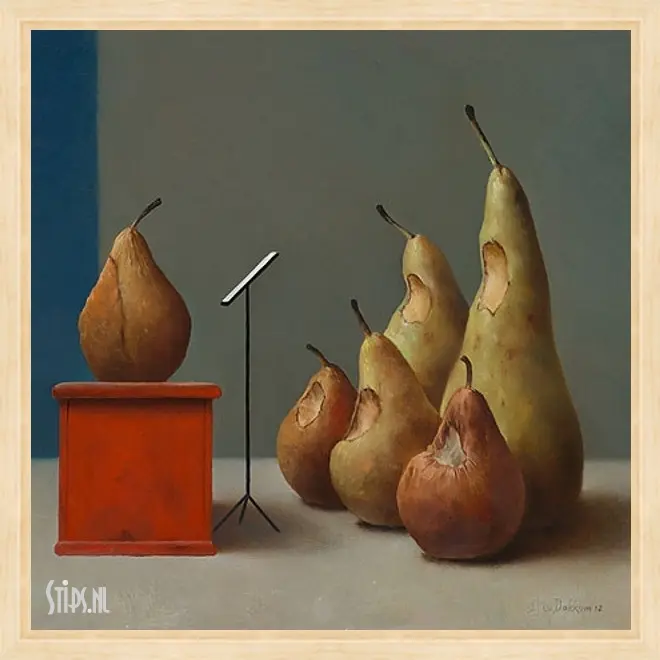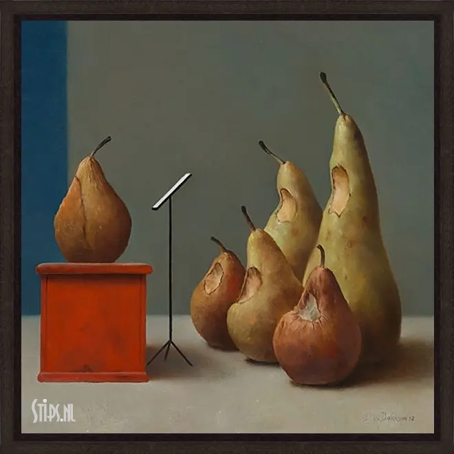 Het koor en de dirigent staan opgesteld. Uit volle borst zingen de peren hun lied onder leiding van de dirigent. Gemengd Koor van Marius van Dokkum is een vrolijke humoristisch kunstwerk. Dit schilderwerk draagt de titel Gemengd Koor en is geschilderd door kunstschilder en illustrator Marius van Dokkum. Situaties uit het dagelijks leven op een hilarische manier in zijn kunstwerken verwerken is waar van Dokkum bekend om staat. Deze peren is één van de meesterwerkjes van zijn hand.