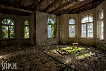 Een verlaten herenhuis in Gdansk – Polen is een portret van een grote kamer met veel ramen rondom. Het zonlicht schijnt door de vensters naar binnen en verlicht de restanten van de eens prachtige parketvloer met heldere strepen. Een van de ramen staat open en laat de weelderig groeiende klimop binnen. Eens was dit de woonkamer in een prachtig herenhuis, nu is het een fotogeniek object dat een verlangen oproept naar verloren tijden.